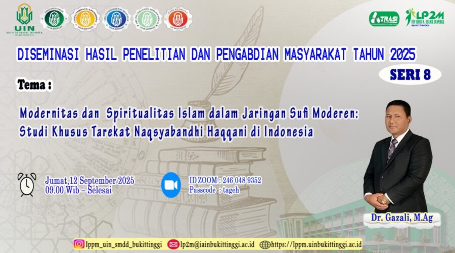 Bukittinggi 12 September 2025 Lembaga Penelitian dan Pengabdian Kepada Masyarakat (LPPM) UIN Bukitinggi kembali menggelar diseminasi hasil penelitian yang ke – 8 pada tahun 2025 ini dengan tema “Modernitas dan Spiritualitas Islam dalam Jaringan Sufi Modren : Studi Kasus Tarekat Naqsyabandhi Haqqani di Indonesia”. Acara ini digelar secara online zoom metting yang di ikuti oleh dosen peneliti UIN Bukittinggi dari berbagai fakultas dan unsur masyarakat. Dr. Gazali, M.Ag sebagai pemateri...Read More