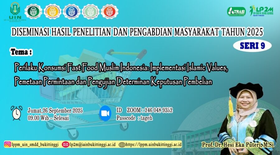 Bukittinggi – Lembaga Penelitian dan Pengabdian Kepada Masyarakat (LPPM) UIN Sjech M, Djamil Djambek Bukittinggi menggelar kegiatan diseminasi hasil penelitian bertajuk “ Perilaku Fast Food Muslim di Indonesia “ pada jumat 26 September 2025 Kegiatan ini dihadiri oleh dosen, mahasiswa, pelaku ekonomi dan masyarakat. Penelitian ini merupakan hasil kerja tim dosen dan mahasiswa dari Fakultas Ekonomi Bisnis Islam (FEBI) yang diketuai oleh Prof, Dr. Hesi Eka Putri, M.Si. Dalam penelitiannya...Read More