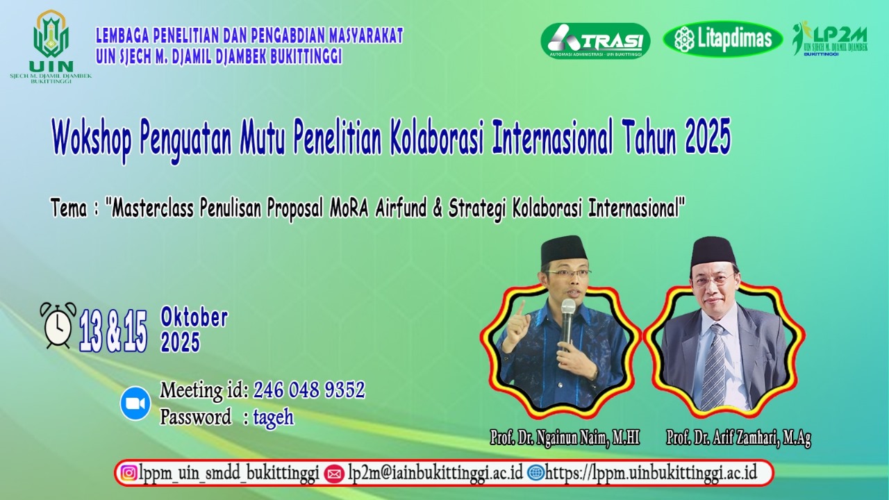 Dalam upaya meningkatkan kualitas dan daya saing penelitian di tingkat global, Lembaga Penelitian dan Pengabdian Kepada Masyarakat (LPPM) UIN Bukittinggi mengadakan workshop Workshop Penguatan Mutu Penelitian Kolaborasi Internasional LP2M Tahun 2025 dengan tema “Masterclass Penulisan Proposal MoRA Air Funds dan Strategi Kolaborasi Internasional” pada tanggal 13 dan 15 Oktober 2025